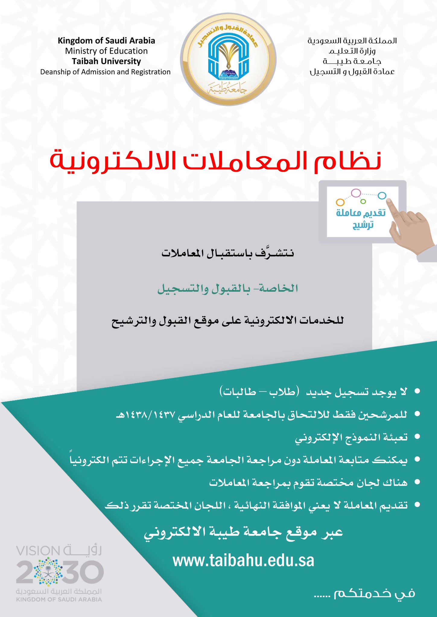 جامعة طيبة Taibah U On Twitter تواصل لديك مشكلة في القبول راسلنا عبر نظام المعاملات الإلكترونية Https T Co Rdhxmox4ab لديك استفسار إسألنا عبر Taibahucare